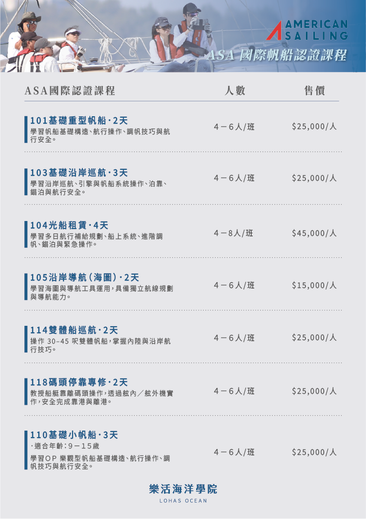 ASA104 光船租賃課程|培養獨立租船、遠距航行的能力。